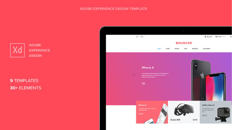 Bouncer is a free Adobe XD UI kit for eCommerce websites. It comes with clean and designed 9 templates, including Homepage, Shop and Product pages, and 30+ elements.